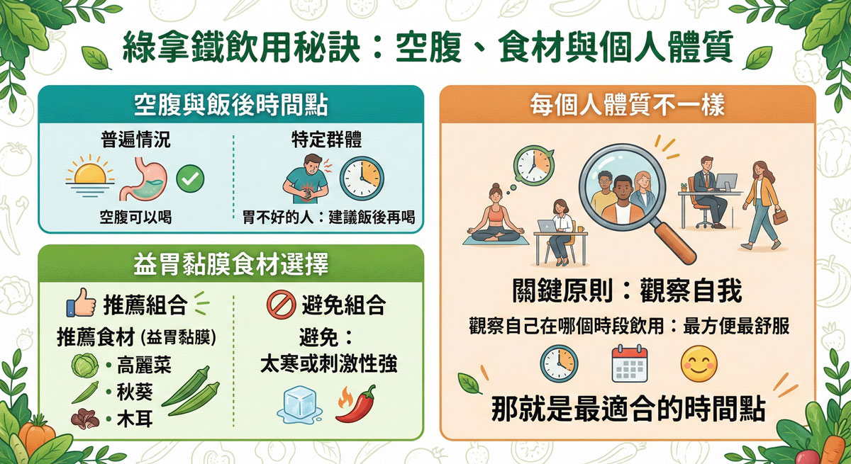 空腹可以喝綠拿鐵,但若胃不好的人建議飯後再喝,並且選擇有益胃黏膜的食材如高麗菜、秋葵、木耳,避免太寒或刺激性強的組合。