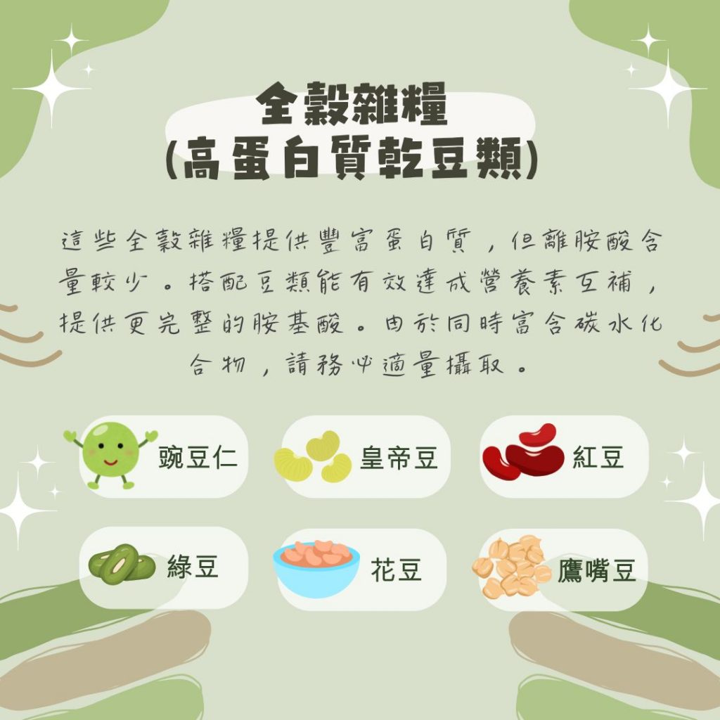 | 豌豆仁 | 全榖雜糧(高蛋白質乾豆類) | 這些全榖雜糧提供豐富蛋白質,但離胺酸含量較少。搭配豆類能有效達成營養素互補,提供更完整的胺基酸。由於同時富含碳水化合物,請務必適量攝取。 |
