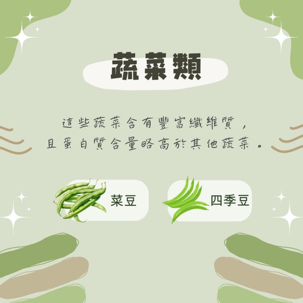| 菜豆 | 蔬菜類 | 這些蔬菜含有豐富纖維質,且蛋白質含量略高於其他蔬菜。 |