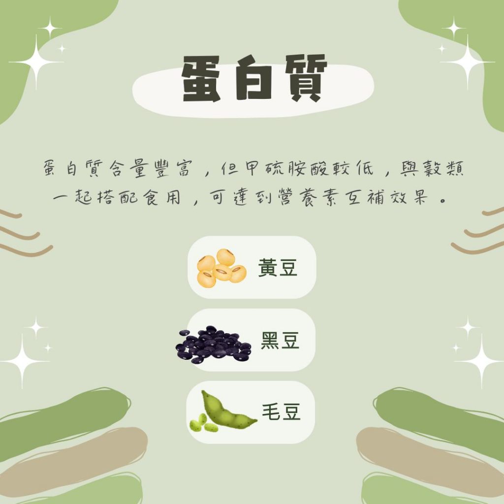 | 黃豆 | 蛋白質 | 蛋白質含量豐富,但甲硫胺酸較低,與穀類一起搭配食用,可達到營養素互補效果。 |