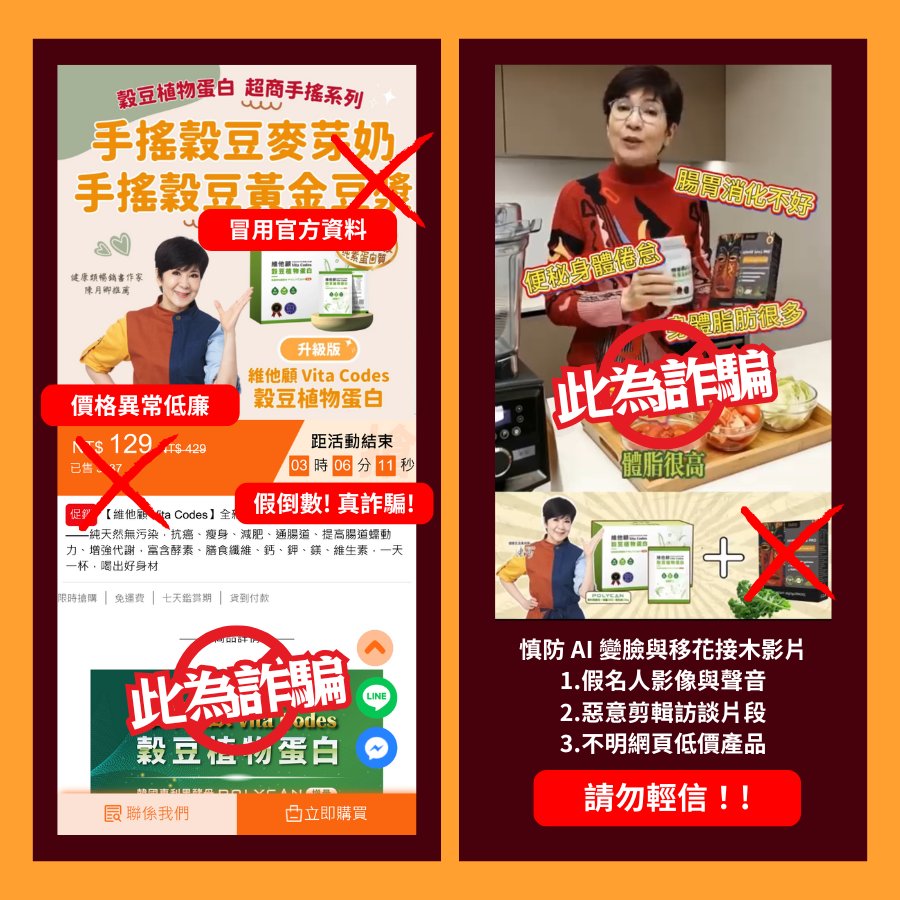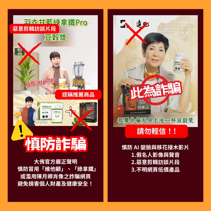 詐騙集團常利用AI技術合成陳月卿老師或名人專家的影像與聲音,並惡意剪輯過去的訪談片段,謊稱推薦來路不明的低價產品。辨識重點: