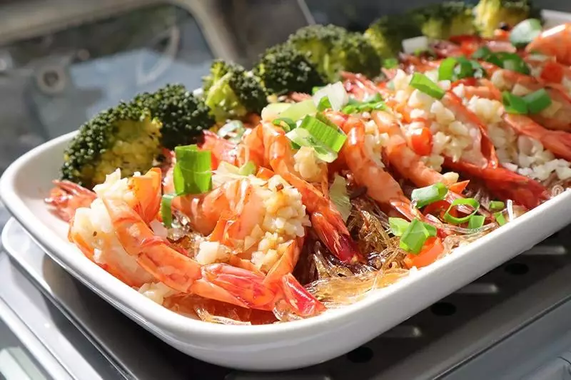 北鼎多功能蒸燉鍋全自動、免看火,能夠上蒸下燉製作出多種年節佳餚(蒜蓉粉蒸蝦/圖由大侑健康提供)