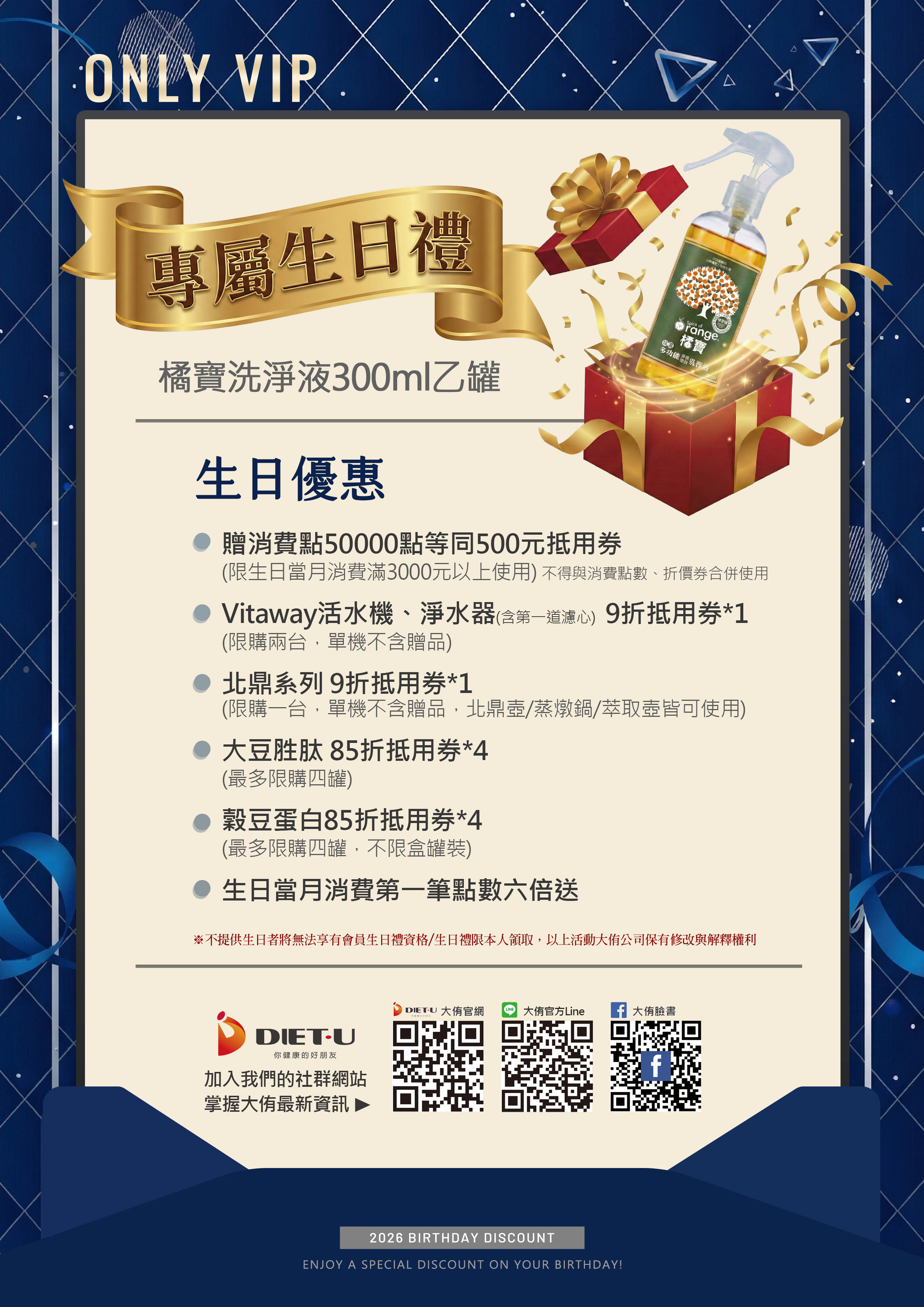 - VIP相關生日權益、生日折價券只限VIP本人於生日當月份使用,不得轉讓,逾期無法追朔。