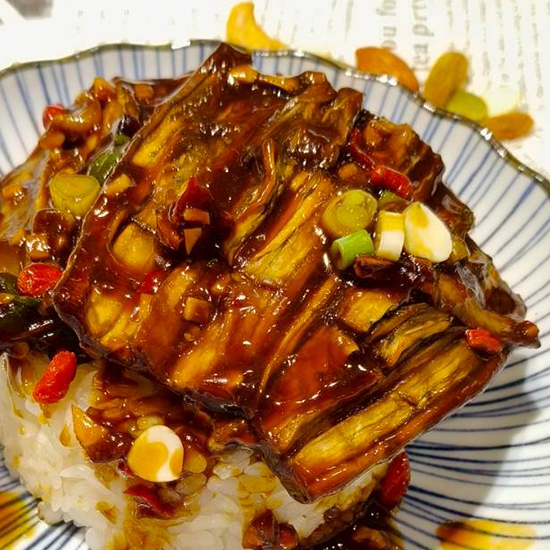 低卡蒲燒茄子鮮嫩多汁,日式健康小菜低卡養生首選!食材 使用機器: 北鼎蒸燉鍋(雙層) 食材: 日式茄子 3條 白芝麻 適量 蔥花 適量 醬汁: 生抽 1勺 老抽 1/2勺 蠔油 1/2勺 砂糖 1/2勺 麵粉 1勺 好水80ml 做法 茄子用橘寶清洗淨後,去頭尾切約7-8cm長段,擺放至白色瓷盤上,蒸燉鍋使用”蒸”功能20分鐘。 將醬汁材料先在碗中調勻備用。 蒸好後茄段,至中間切開1/2且不切斷,刀尖輕輕在內側白色果肉劃數將茄肉平均攤平。 處理好的茄肉皮的部分朝下,平底鍋放少量油小火乾煎上色,再翻面煎至兩面微焦。 倒入調味好的醬汁,開大火收湯汁至微微濃稠後,立即關火。 白飯放上沾滿濃醬汁的茄肉排,撒上少許白芝麻和蔥花即可食用。 營養分析 食譜出處 新光西門-楊淑玲 羅漢果紅棗雪梨茶 previous 南部碗粿 next