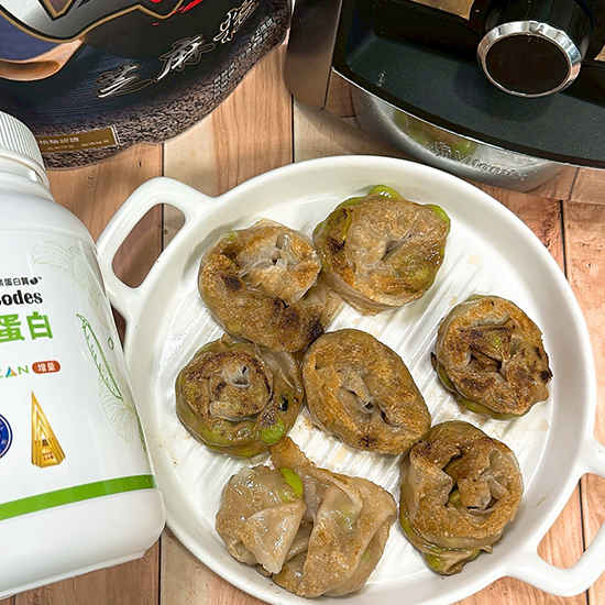 - 用香油熱平底鍋,將毛豆高蛋白捲放鍋中,兩面煎至金黃即完成。