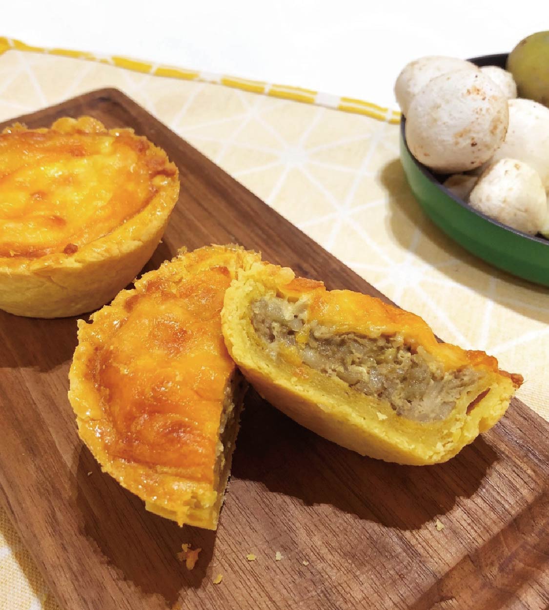 2. 鍋內放少許橄欖油,放入切碎的洋蔥丁,炒至透明軟化,再下蘑菇丁、馬鈴薯丁炒至油亮,並加入鹽和胡椒調味。炒好冷卻後,取適量炒料鋪在烤好的派皮中,備用。