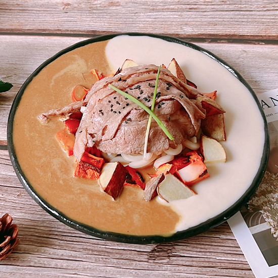 4. 將麵體用碗定型後取一中盤,將烏龍麵倒扣入盤中央,平均放入烤熟的紅蘿蔔與馬鈴薯,同時倒入雙醬,使其各佔半盤麵積.