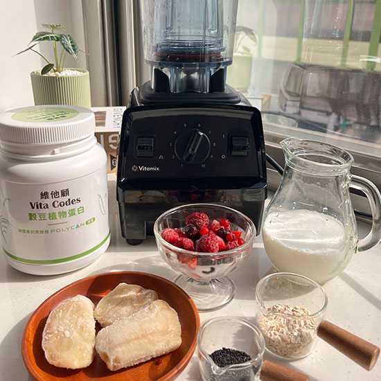 莓果高蛋白奶昔跟著多慧一起變漂亮食材 使用機器: Vitamix調理機 食材: 穀豆植物蛋白2大匙 黑芝麻1大匙 香蕉一根 燕麥一大匙 冷凍莓果70G 牛奶200~250CC 做法 使用Vitamix調理機,將食材依序倒入容杯內,使用果席模式或是最高速,研磨約40秒即可. 營養小知識 營養分析 食譜出處 心心老師 好蘋可可燕麥糕 previous OREO香草奶昔 next