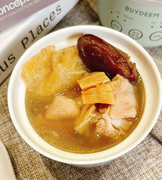 金華干貝花膠燉雞一鍵按下就可以繼續工作,安靜無聲 時間到就能享用「一人份」的頂級滋補!🥣食材 使用機器: 北鼎多功能烹煮壺 食材: 雞腿塊 4塊 金華火腿 1片 干貝 2顆 椰棗 2顆 花膠 1片 好水 約400c.c. 做法 將食材一併置入K32壺中,蓋上上蓋,依序按下啟動+100度+90分鐘+啟動按鍵。 烹煮行程結束後,即完成。 營養小知識營養分析 食譜出處 Polly老師 黑豆桂圓紅棗茶 previous 羅漢果紅棗雪梨茶 next